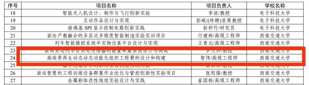 近日,四川省教育厅下发了《关于公布 2023 年省级高等学校创新性实验项目名单的通知》(川教函〔2023〕446号),永利官网智伟老师作为负责人的项目《高效骨再生动态动态功能化组织工程骨的设计和构建》成功获批。