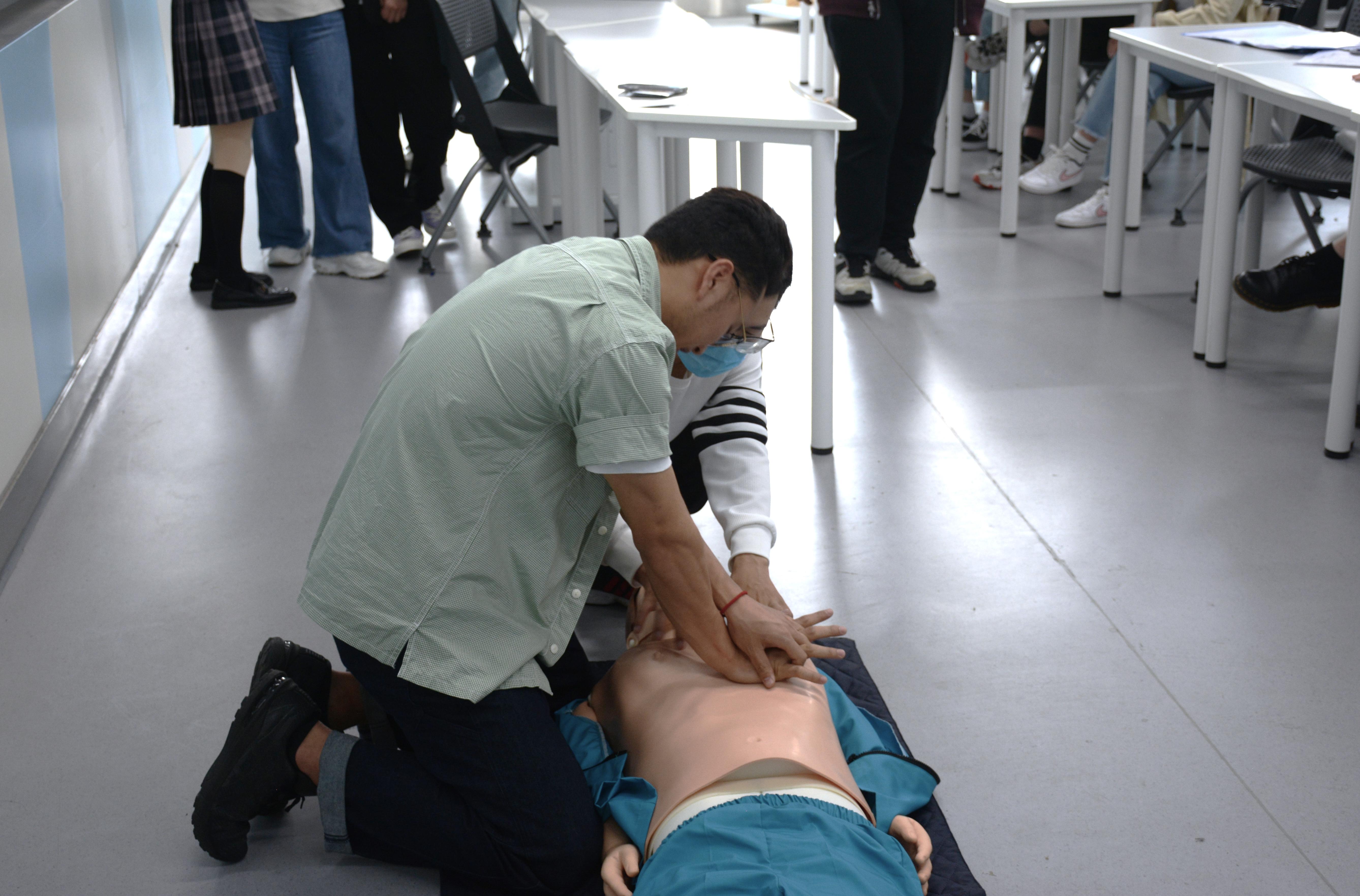 理论学习后进入现场演练环节,刘晓翰同学利用医用假人进行心肺复苏模拟示范。在示范的过程中,刘晓翰同学不仅展示了其专业、熟练的心肺复苏技能,还就心肺复苏实际操作中容易出现的问题和注意事项进行逐一讲解。
