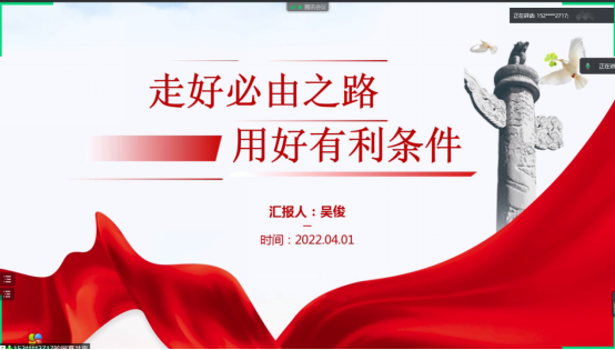 2022年4月1日晚,因疫情防控原因,临床第二党支部于线上召开了“用好有利条件,走好必由之路”两会精神专题学习会。会议的主要内容是学习习近平总书记在“两会团组时间”提出的两个重要论断。本次学习由党支部书记张雪同志主持,吴俊同志领学,支部全体党员和入党积极分子参加。