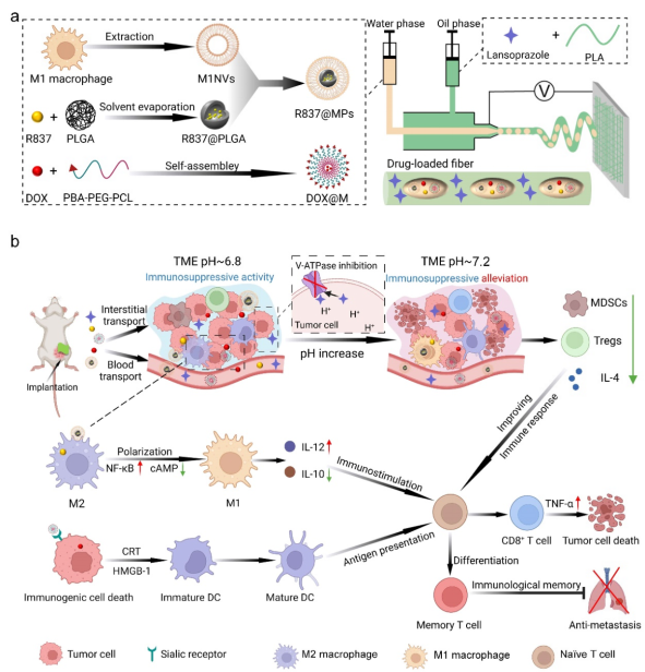 a.装载LPZ、DOX@M胶束和R837@MPs的多级结构电纺纤维的制备。b.局部酸性TME重塑机制及免疫治疗过程。